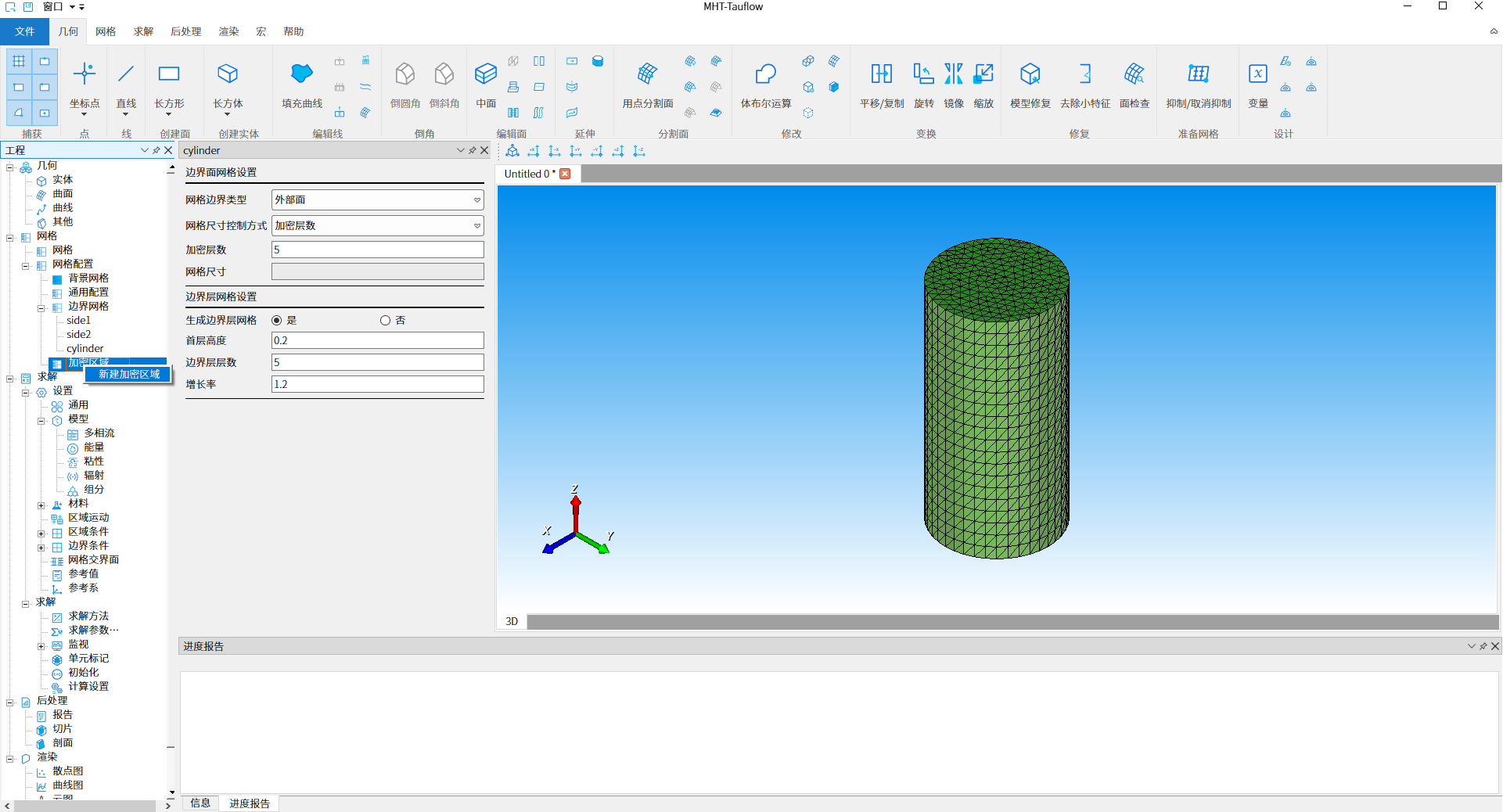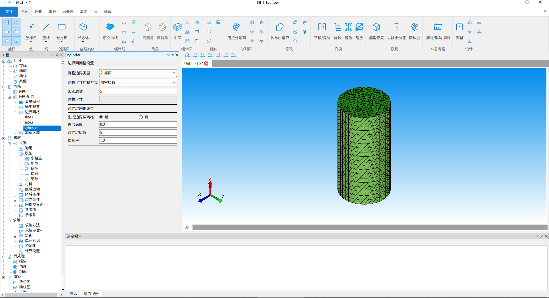 双击工程树结构【网格- 网格配置-边界网格 - cylinder】节点,进行边界网格设置,如下图9所示,选择生成边界层网格『是』单选按钮,其他参数此处使用默认值