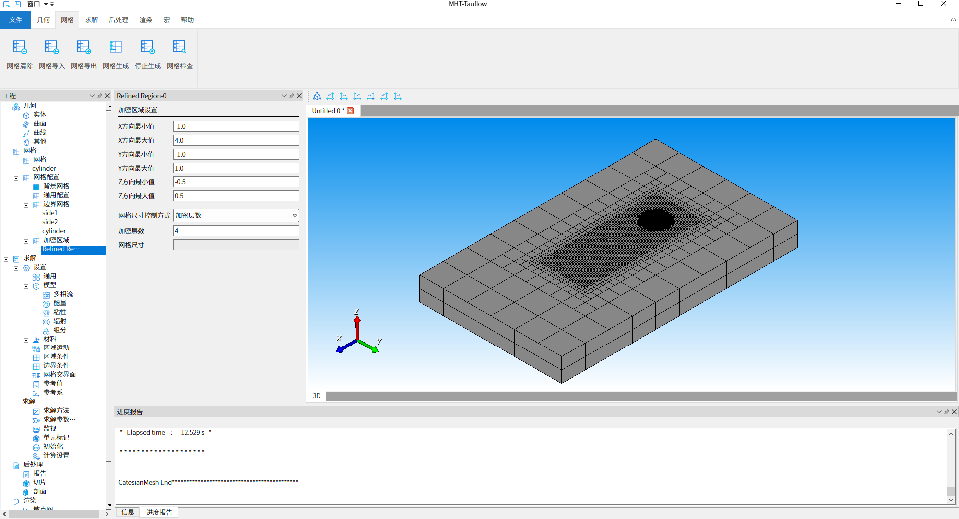 双击工程树结构【网格-网格配置-加密区域-Refined Region-0】节点,此处使用默认参数进行加密区域设置,如下图11所示