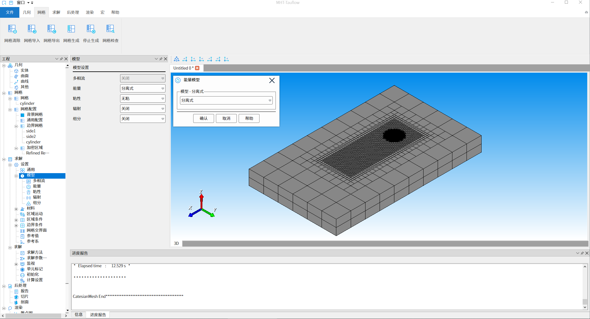 双击工程树结构【求解- 设置 - 模型】节点,在模型设置『能量』下拉框中选择“分离式”选项,点击『确定』按钮,完成开启能量方程操作,如下图14所示